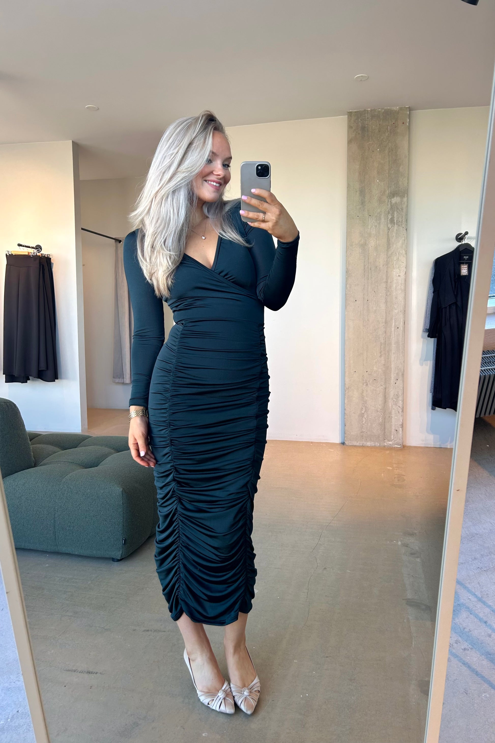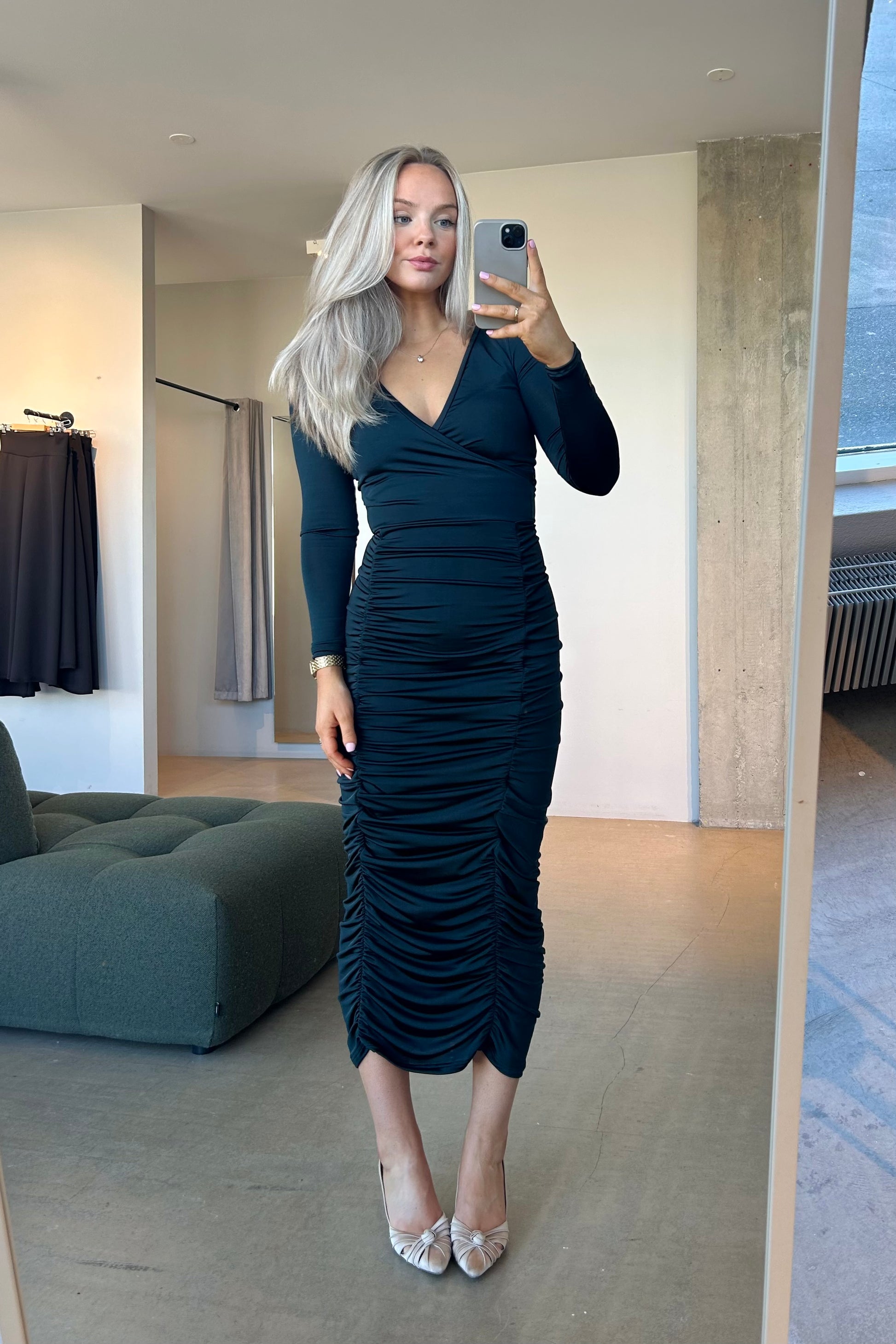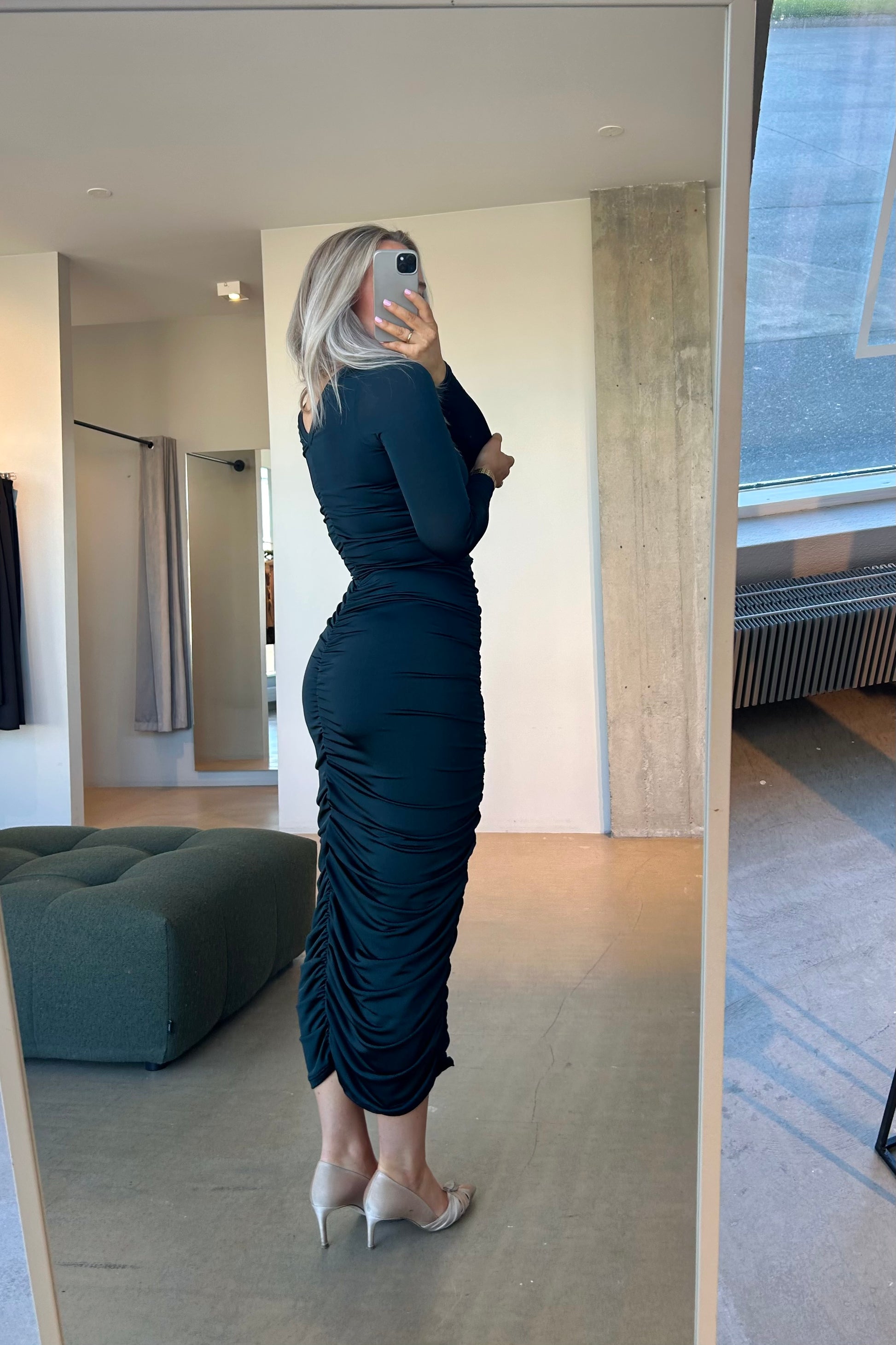 Brim er síður kjóll með rykkingum í pilsi og í baki.