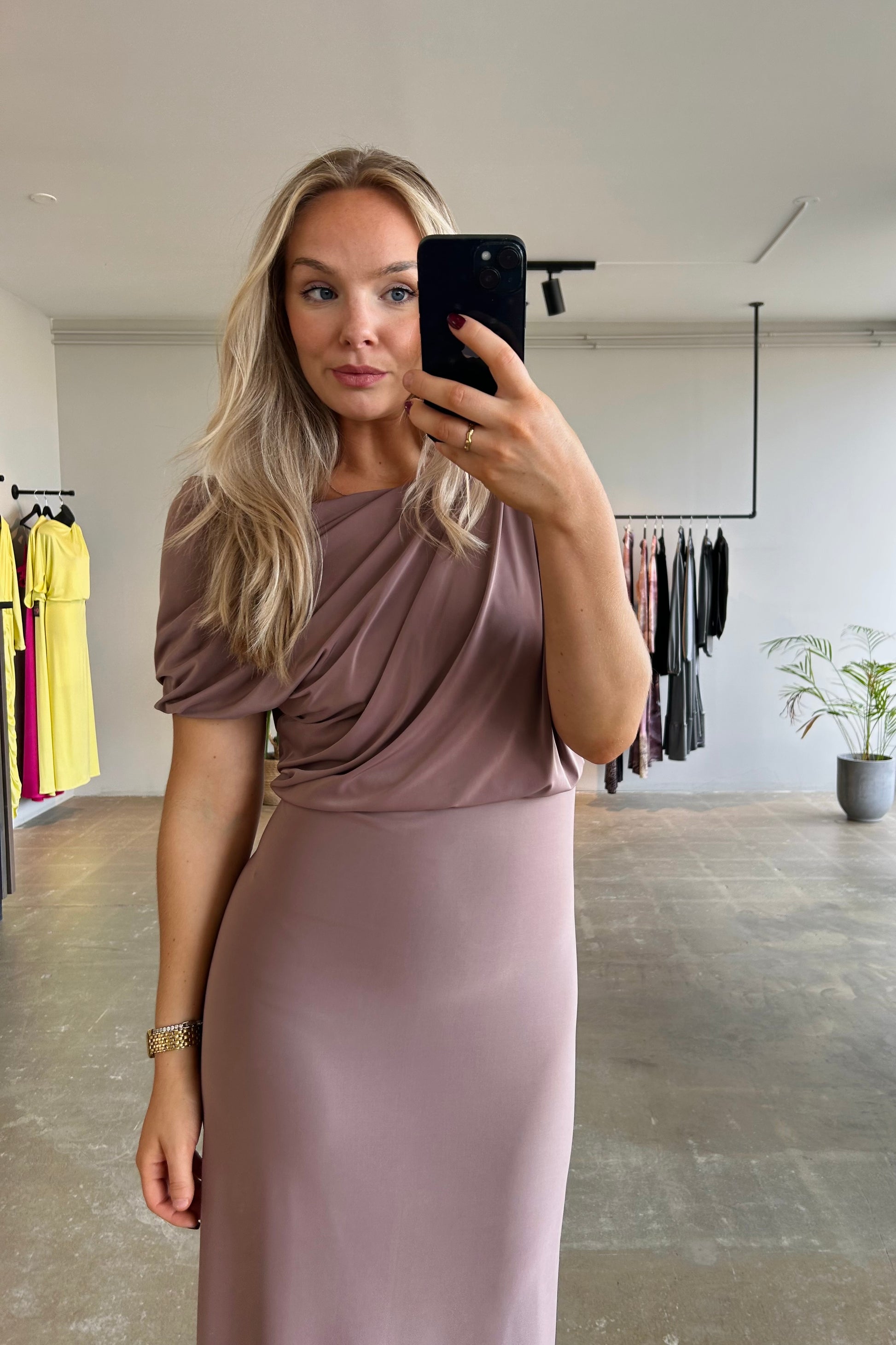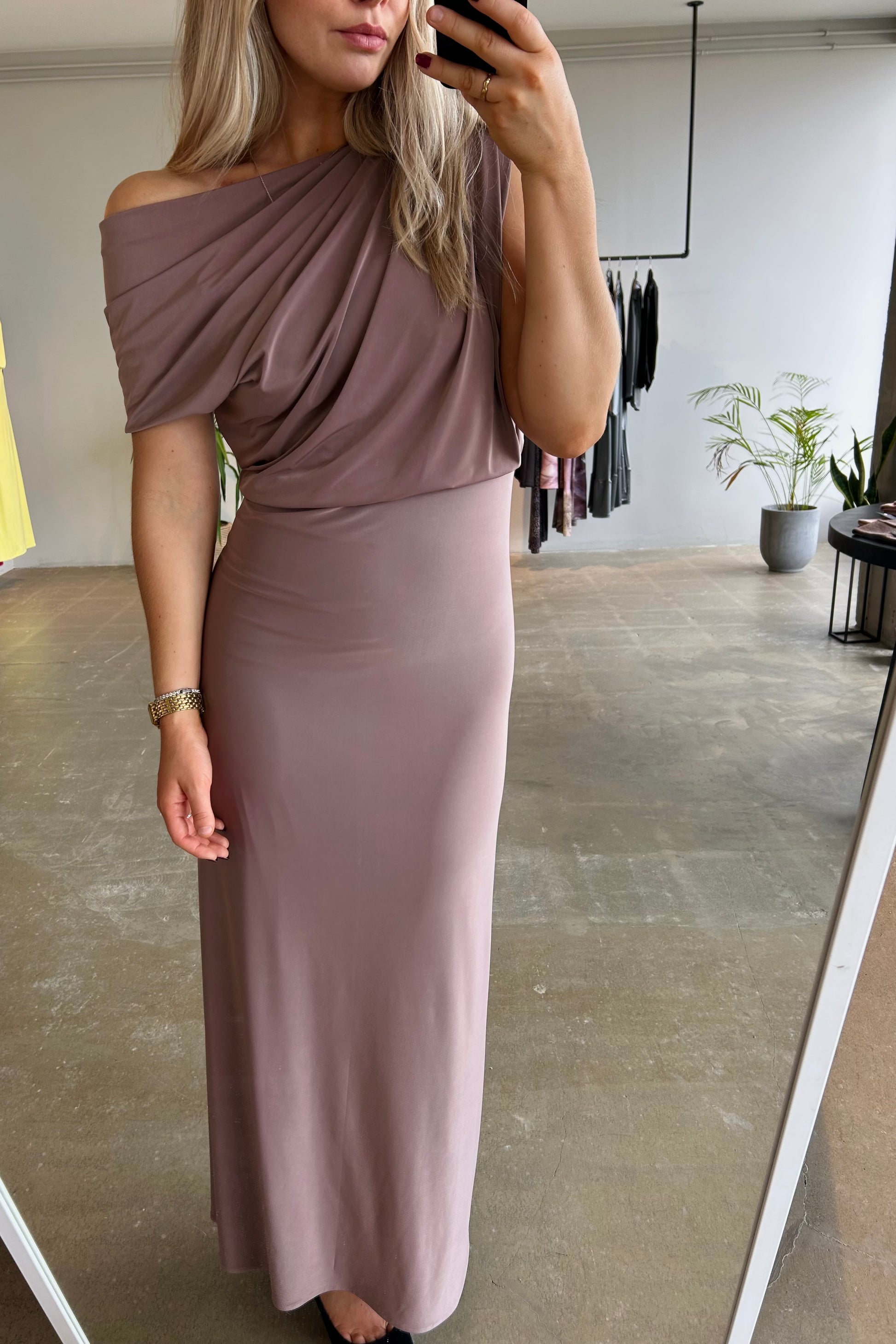 Foss kjóllinn er ökklasíður sparikjóll með víðu toppstykki og lausu pilsi sem er tekið saman í mittinu. Toppstykkið á kjólnum býður uppá þann möguleika að taka aðra ermina niður öxlina, eða setja ermina uppá öxlina og leyfa hálsmálinu að hanga annaðhvert fram eða aftur.